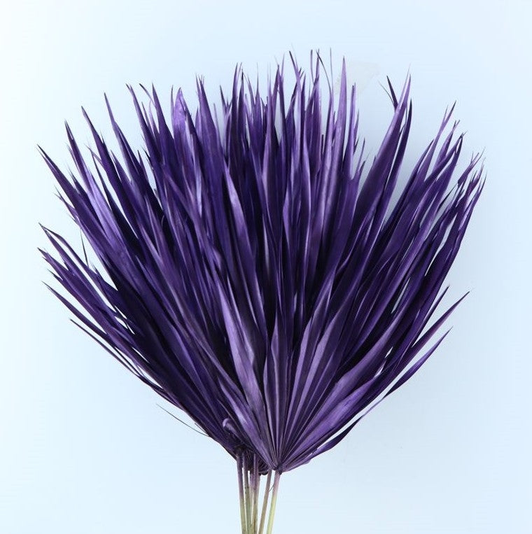 Diese großen getrockneten Chamaerops -Blätter sind lila gestrichen und haben eine Flügelspannweite des Chamaerops -Blattes von 27 - 32 cm. Die Länge des Griffs einschließlich des Blattes beträgt 70 cm. Sie können diese Chamaerops -Blätter pro Stück bestellen.