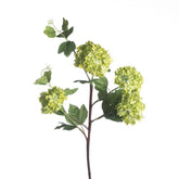 Deze volle zijden viburnum snowball is een frisse en natuurlijke toevoeging aan elk zijden boeket. De tak is rijk gevuld met vier bolvormige bloemclusters in een zachte groentint, gecombineerd met realistisch blad en een natuurlijke vertakking.