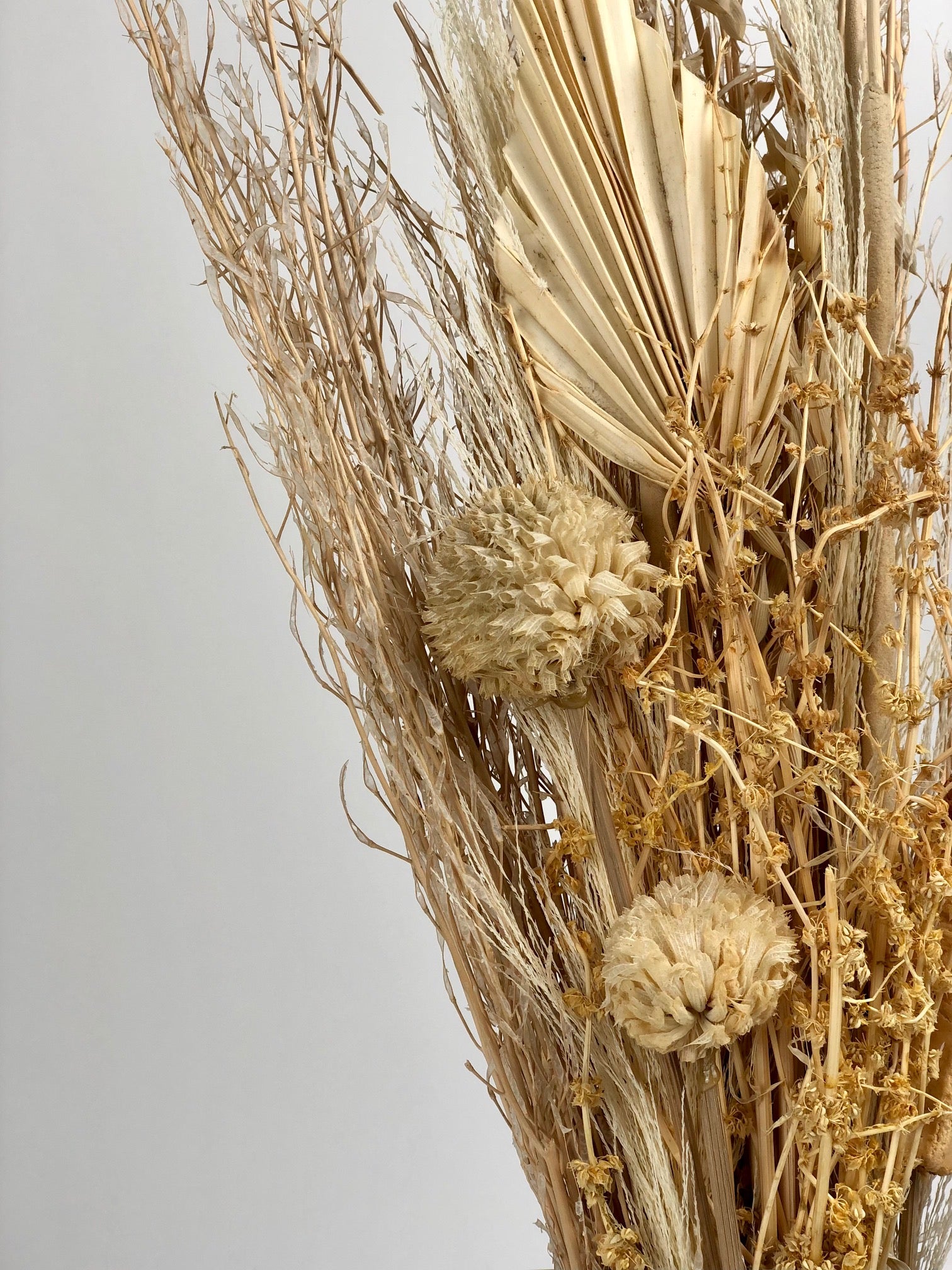 Bouquet sec de luxe avec lance de palmier séchée et naturelle, avena séchée, luffa, typha brune et panaches de pampa blanc et naturel. Le bouquet mesure environ 60 cm de long.